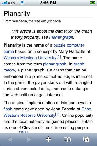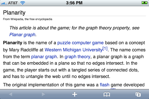 This afternoon I made a custom stylesheet and script to format Wikipedia nicely for me when I am logged on from my iPhone. If you have a Wikipedia account, you can easily use them by adding them to your own monobook.css and monobook.js. Screenshots below.